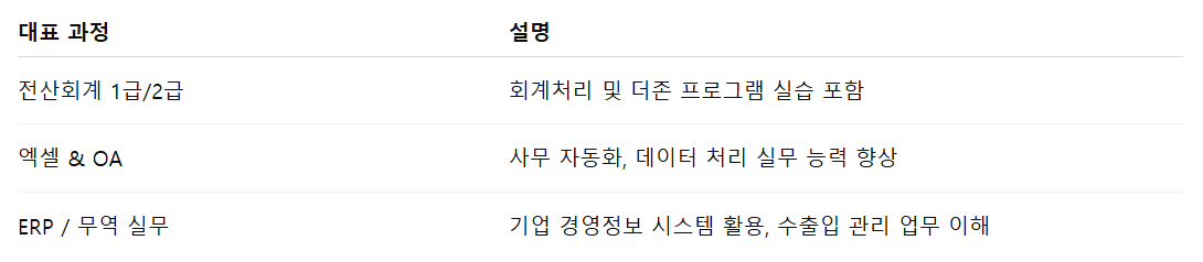 📌 수료 후 진로: 일반 사무직, 회계담당자, 무역관리자, 인사총무