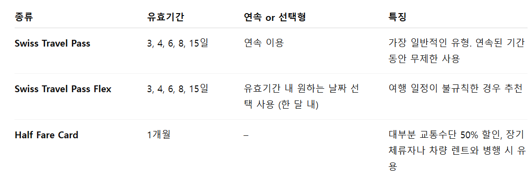 스위스 여행의 필수 아이템 중 하나인 Swiss Travel Pass는 여행 일정에 따라 다양한 종류와 혜택을 제공하는 교통 패스입니다. 아래에 종류, 비용, 사용 용도에 대해 자세히 소개해 드릴게요.